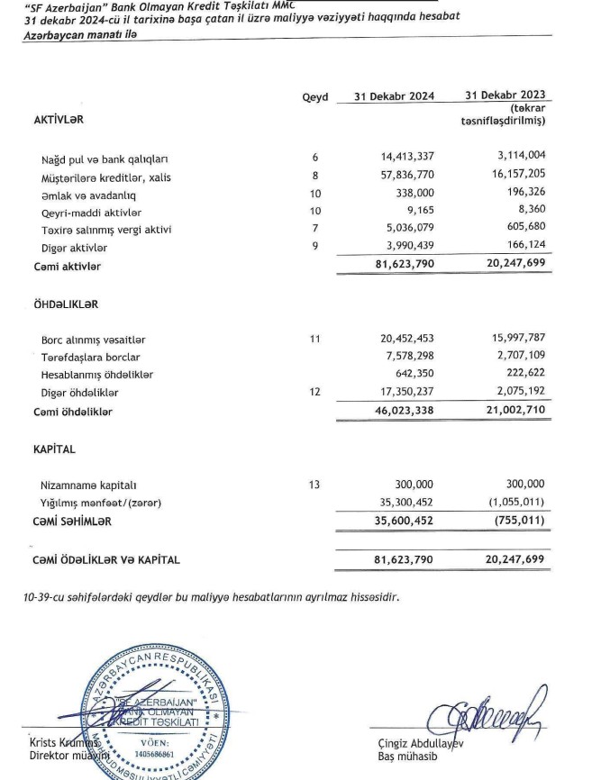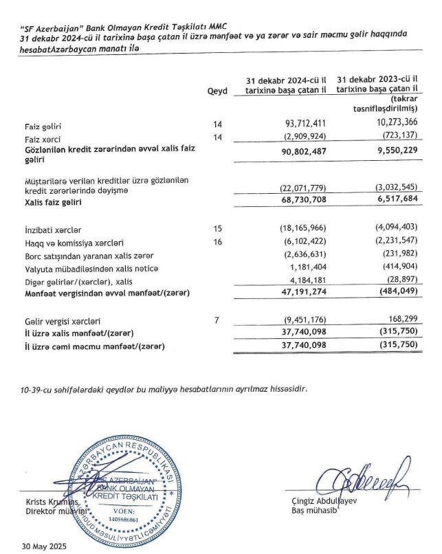Marja.az xəbər verir ki, "SF Azerbaijan” BOKT MMC-nın faiz gəlirləri 2023-cü ildə 10 milyon 273 min manat ikən, 2024-cü ildə 93 milyon 712 min manata çatıb (9 dəfədən çox artıb). Ötən il təşkilatın cəmi gəlirləri 99 milyon 77 min manat, cəmi xərcləri 61 milyon 335 min manat olub.