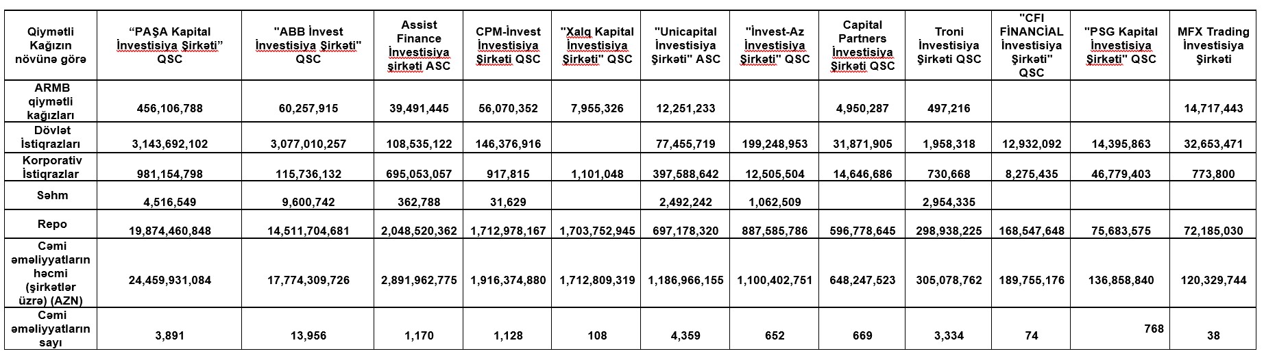 Marja.az Birjaya istinadən xəbər verir ki, “PAŞA Kapital İnvestisiya Şirkəti” QSC 24 milyard 459 milyon 931 min manat dövriyyə ilə 1-ci, "ABB İnvest İnvestisiya Şirkəti" QSC 17 milyard 774 milyon 310 min manat dövriyyə ilə 2-ci, "Assist Finance İnvestisiya Şirkəti" ASC 2 milyard 48 milyon 520 min manat dövriyyə ilə 3-cü yeri tutub.