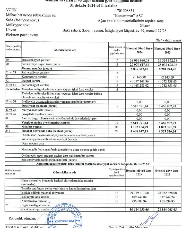 Marja.az xəbər verir ki, “Konstromat” şirkətinin satışdan gəliri 2023-cü ildə 36 milyon 317 min manat ikən, 2024-cü ildə 38 milyon 17 min manata yüksəlib (1 milyon 700 min manat və ya 4,7% artıb). Gəlir ilə bərabər satışın maya dəyəri üzrə xərclər də artıdığından gəlirdəki artım mənfəətdə çox əks olunmayıb.
