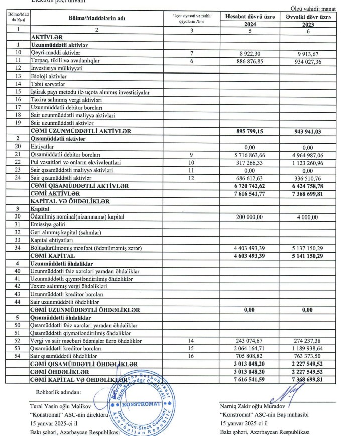“Konstromat” ASC 31 dekabr 2024-cü il tarixində 7 milyon 617 min manat cəmi aktivlərə malik olub. Şirkət 2023-cü ilin sonunda 7 milyon 369 min manat cəmi aktivlərə malik idi.