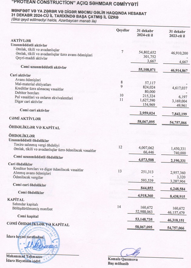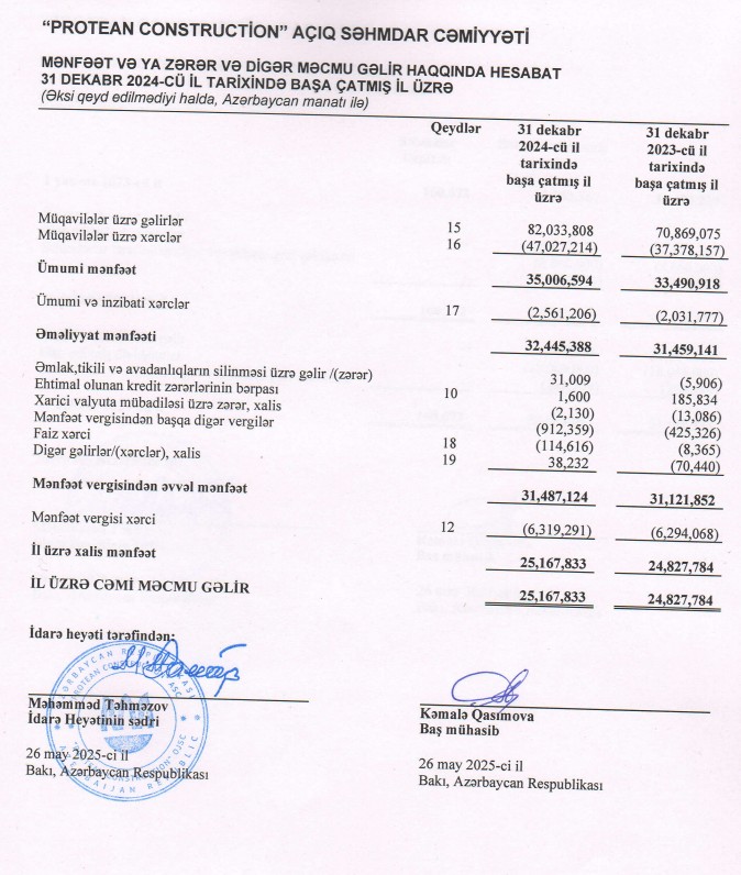 “Protean Construction” ASC 2024-cü ili 25 milyon 168 min manat xalis mənfəət ilə başa vurub. Şirkət 2023-cü ili 24 milyon 928 min manat xalis mənfəət ilə bağlamışdı. Beləliklə, “Protean Construction”ın xalis mənfəəti 2024-cü ildə 2023-cü illə müqayisədə 240 min manat və ya 1% artıb.