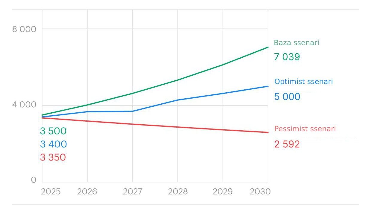 1. Baza: 5000 dollar/ unsiya (ildə +8%) — qlobal eskalasiya, mülayim inflyasiya, stabil qızıl alışı olmadan geosiyasi gərginlik.