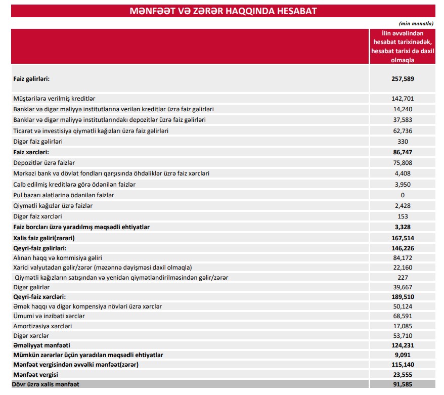 Bank ötən ilin eyni dövrünü 119 milyon 60 min manat xalis mənfəət ilə bağlamışdı.