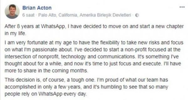 "Marja" xəbər verir ki, Facebook-dakı şəxsi hesabından qısa bir açıqlama edən Acton, qazanc məqsədi güdməyən yeni bir təşkilat yaratmaq üçün yaradıcılarından olduğu Whatsapp-dan ayrılacağını bildirib.