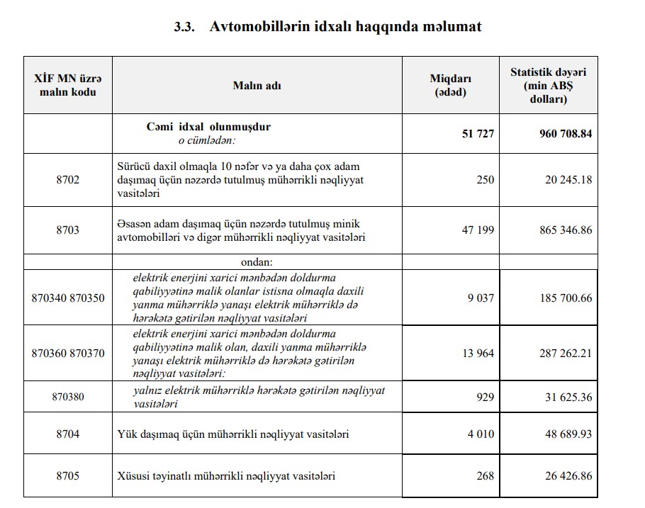 Müqayisə üçün qeyd edək ki, 2024-cü ilin 1-ci yarısında (yanvar-iyun) Azərbaycana 779 milyon 364 min dollar dəyərində 42 min 335 ədəd nəqliyyat vasitəsi idxal olunmuşdu. Beləkilə, bu ilin ilk 6 ayında 9 min 392 ədəd daha çox avtomobil idxal edilib.