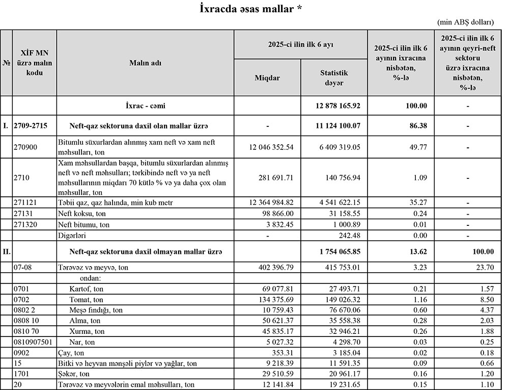 2025-cü ilin yanvar-iyun aylarında (ilk 6 ayda) Azərbaycanın ən çox ixrac və idxal etdiyi mallar.