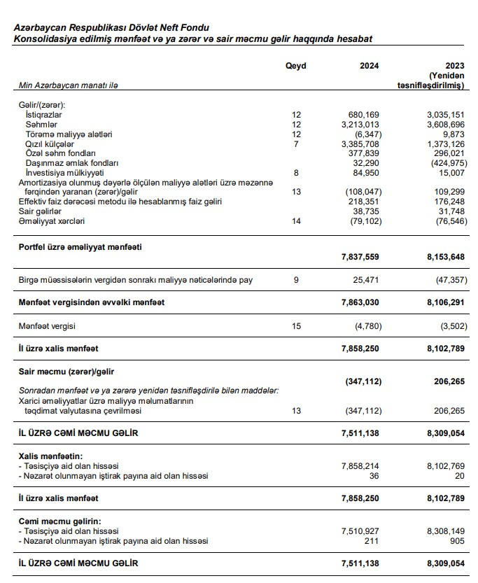 Azərbaycan Respublikası Dövlət Neft Fondu (ARDNF) 2024-cü ili 7 milyard 858 milyon 250 min manat xalis mənfəət ilə başa vurub. Fond 2023-cü ili 8 milyard 102 milyon 89 min manat xalis mənfəət ilə bağlamışdı. Beləliklə, ARDNF-in xalis mənfəəti 2024-cü ildə 2023-cü illə müqayisədə 244 milyon 539 min manat və ya 3% azalıb.