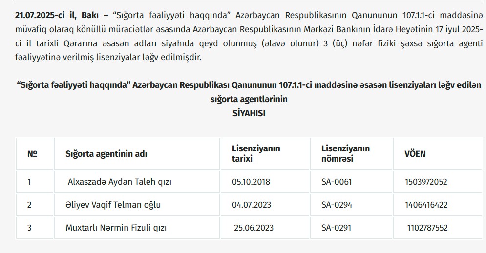 Azərbaycan Mərkəzi Bankı 3 fiziki şəxsə verdiyi sığorta agenti lisenziyasını ləğv edib.