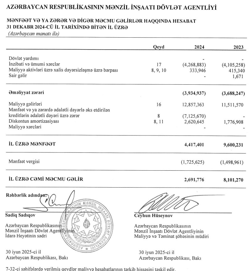 Azərbaycan Respublikasının Mənzil İnşaatı Dövlət Agentliyi 2024-cü ili 2 milyon 692 min manat xalis mənfəət ilə başa vurub. Agentlik 2023-cü ili 8 milyon 101 min manat xalis mənfəət ilə bağlamışdı. Beləliklə, Mənzil İnşaatı Dövlət Agentliyinin xalis mənfəəti 2024-cü ildə 2023-cü illə müqayisədə 3 dəfə azalıb.