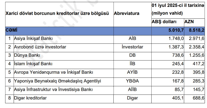 Bülletendən məlum olur ki, Azərbaycan ən çox Asiya İnkişaf Bankından borc alıb.