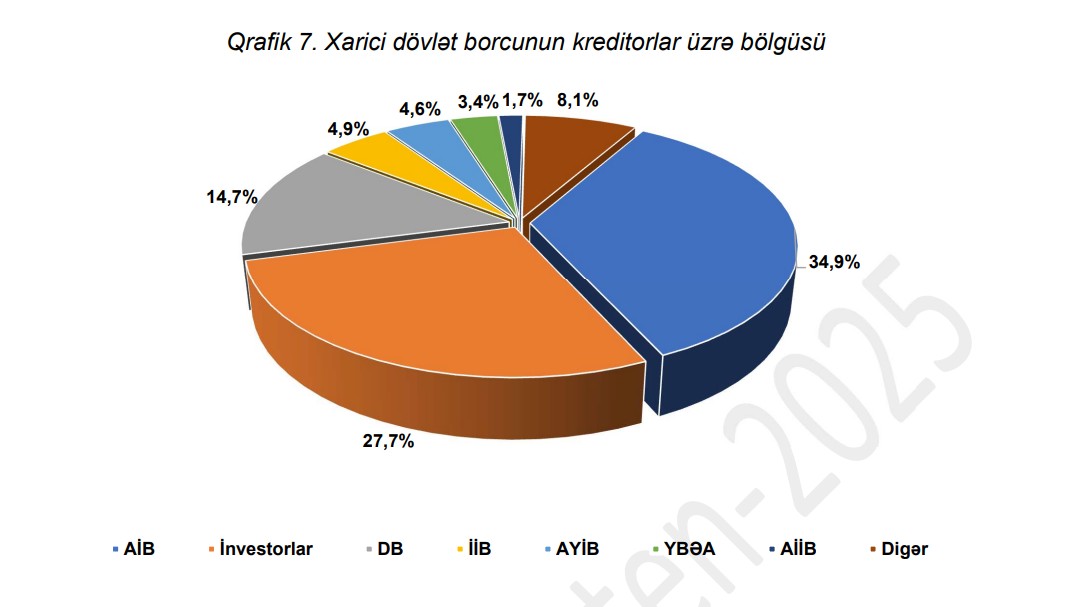 2025-ci ilin 01 iyul tarixinə xarici dövlət borcu portfelinin 34,9%-i Asiya İnkişaf Bankının, 27,7%-i avrobondların, 14,7%-i Dünya Bankının, 22,7%-i isə digər kreditorlardan cəlb edilmiş öhdəliklərin payına düşür.