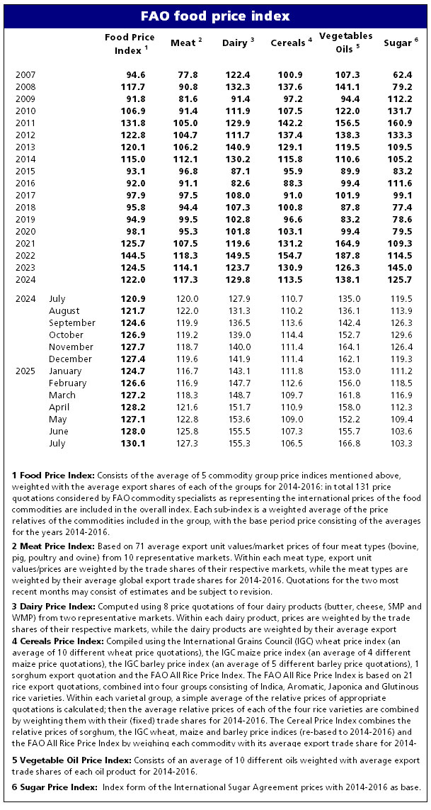 Qlobal ərzaq qiymətlərində artım iyun ayından sonra iyul ayında da davam edib. Birləşmiş Millətlər Təşkilatının Ərzaq və Kənd Təsərrüfatı Təşkilatının (FAO) 2025-ci ilin iyul məlumatlarına əsasən, son aylarda qlobal ərzaq qiymətləri artmaqda davam edir. FAO-nun Ərzaq Qiymətləri İndeksinin artımına xüsusilə ət və bitki yağının qiymətlərində güclü artımlar səbəb olub, taxıl, süd məhsulları və şəkərin qiymətlərində isə ucuzlaşma müşahidə olunub.Birləşmiş Millətlər Təşkilatının (BMT) Ərzaq və Kənd Təsərrüfatı Təşkilatının (FAO) Ərzaq Qiymətləri İndeksi (ƏQİ) 2025-ci ilin iyul ayında orta hesabla 130,1 bənd təşkil edib ki, bu da iyun ayı ilə müqayisədə 2,1 bənd və ya 1,6 faiz artım deməkdir.