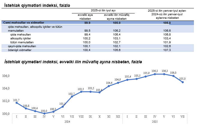 2025-ci ilin iyul ayında istehlak qiymətləri indeksi əvvəlki aya nisbətən 0,1 faiz azalıb (deflyasiya), yanvar-iyul aylarında isə əvvəlki ilin müvafiq dövrünə nisbətən 5,8 faiz artıb.