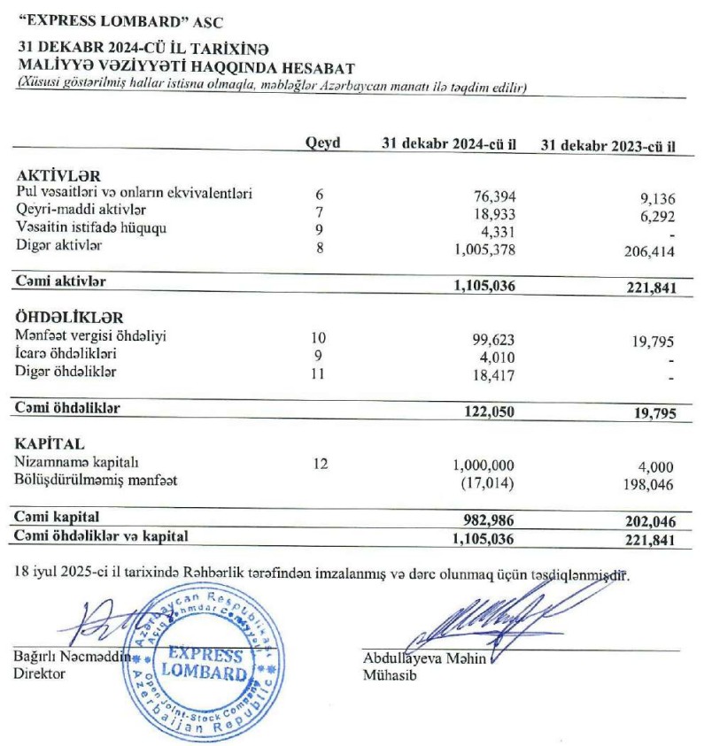 Ötən il "Express Lombard"ın cəmi aktivləri 5 dəfə artaraq 31 dekabr 2024-cü il tarixində 1 milyon 105 min manata çatıb. ASC 2023-cü ilin sonunda 222 min manat cəmi aktivlərə malik idi.