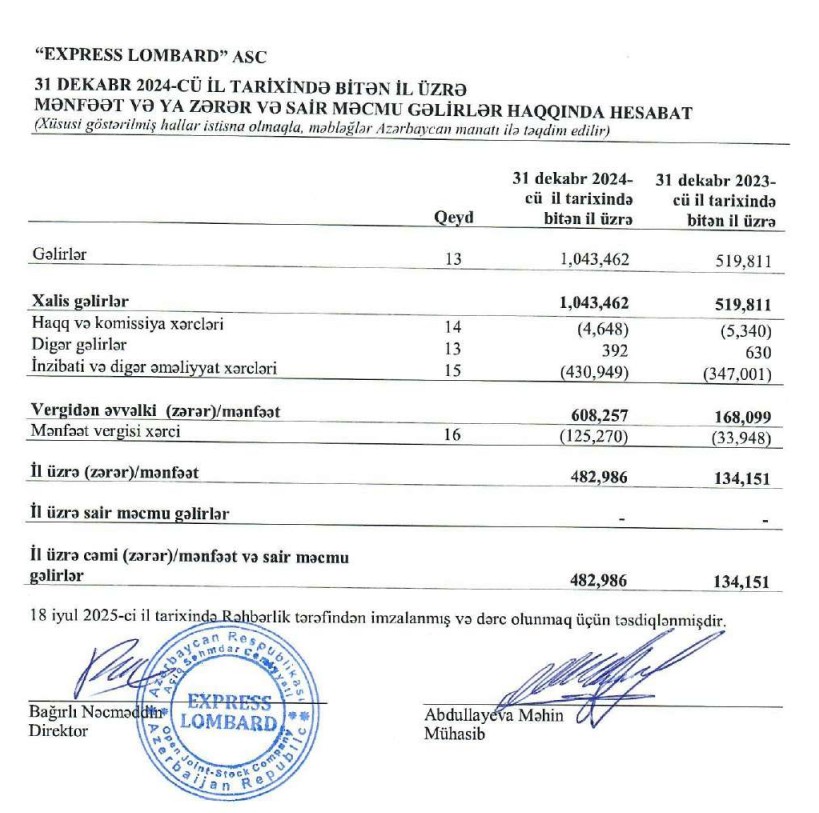 "Express Lombard" ASC 2024-cü ili 483 min manat xalis mənfəət ilə başa vurub. Şirkət 2023-cü ili 134 min manat xalis mənfəət ilə balamışdı. Beləliklə, "Express Lombard"ın xalis mənfəəti 2024-cü ildə 2023-cü illə müqayisədə 3,6 dədə artıb.