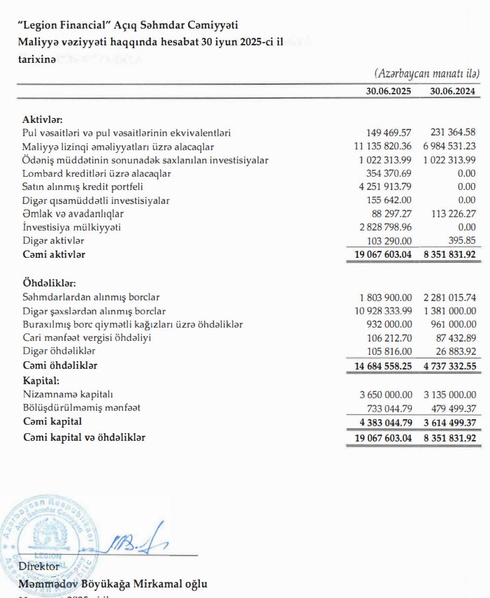 30 iyun 2025-ci iltarixində "Legion Financial" ASC-nin maliyyə lizinqi portfeli 11 milyon 136 min manata çatıb ki, bu da ötən ilin eyni dövrü ilə müqayisədə 4 milyon 151 min manat və ya 59,4% çoxdur.