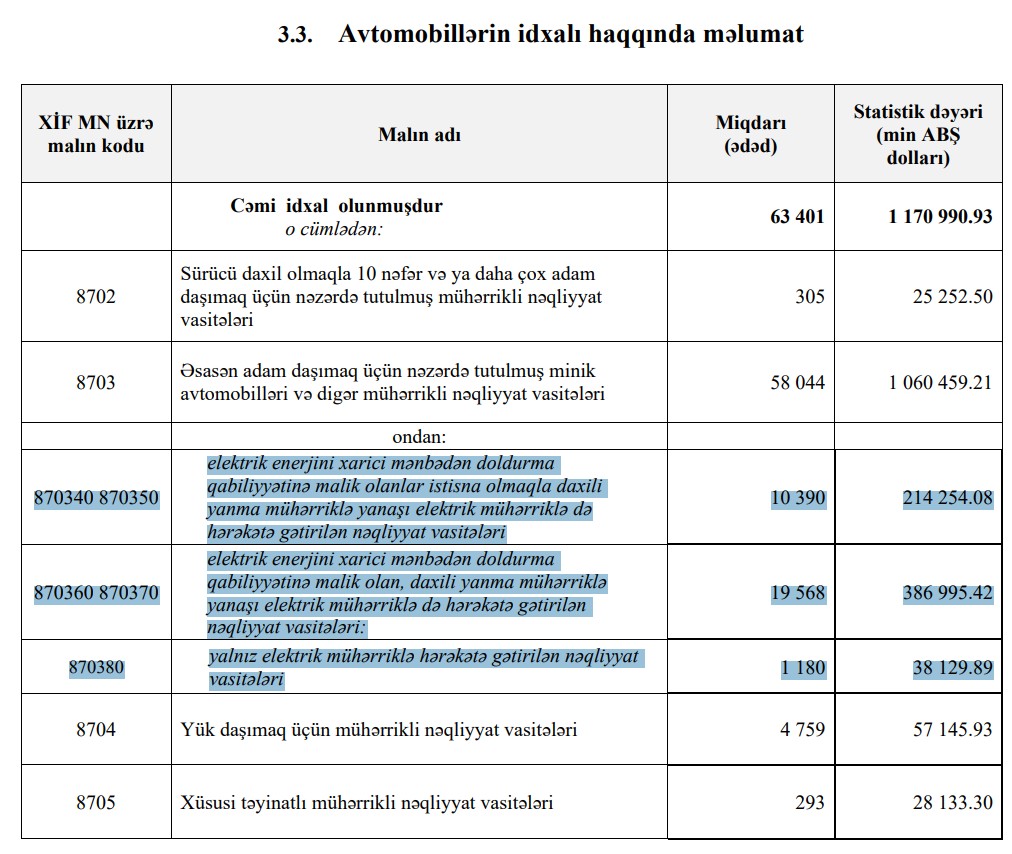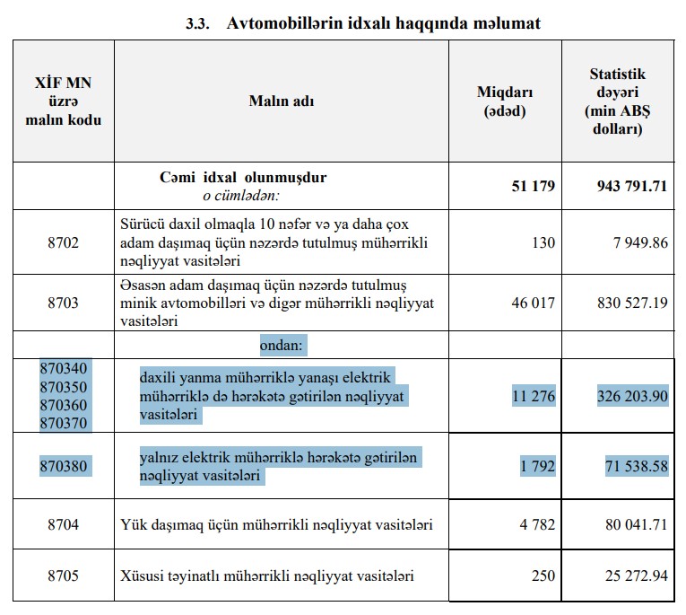 O cümlədə, bu ilin bu ilin 7 ayında Azərbaycana 31 min 138 ədəd hibrid (hybrid), plagin-hibrid (Plug-In Hybrid) və tam elektrik (elektromobil) nəqliyyat vəasitəsi idxal olunub. Bu rəqəm ötən ilin 7 ayında 14 min 860 ədəd idi (2,1 dəfə artıb).