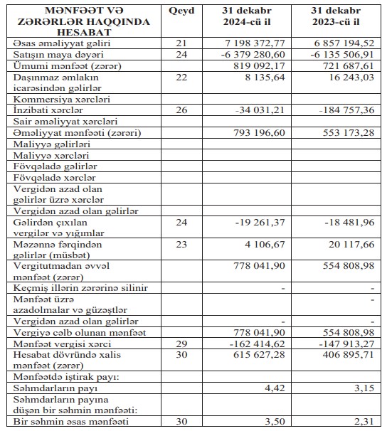 Marja.az xəbər verir ki, Şirkətin əsas əməliyyat gəlirləri (satış) 2023-cü ildə 6 milyon 857 min manat ikən ,2024-cü ildə 7 milyon 198 min manat təşkil edib (341 min manat və ya 4,5% artıb).