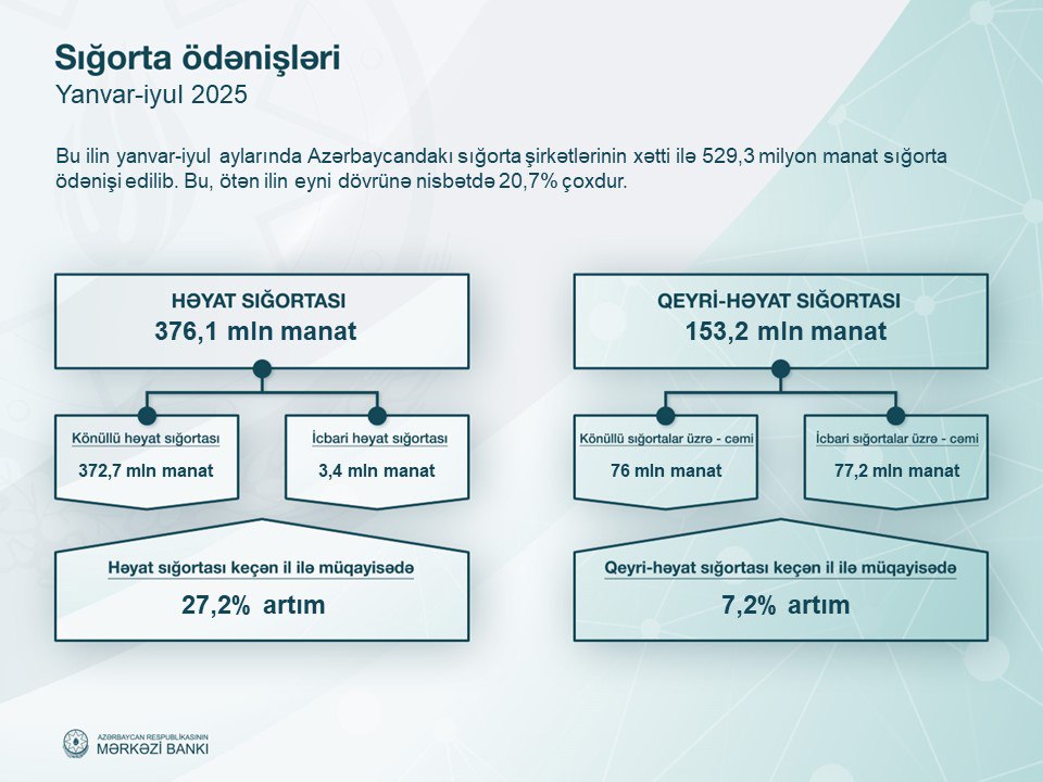 2025-ci ilin yanvar-iyul aylarında (7 ayda) Azərbaycandakı sığorta şirkətlərinin xəttilə 529,3 milyon manat sığorta ödənişi həyata keçirilib ki, bu da ötən ilin eyni dövrü ilə müqayisədə 20,7% çoxdur.