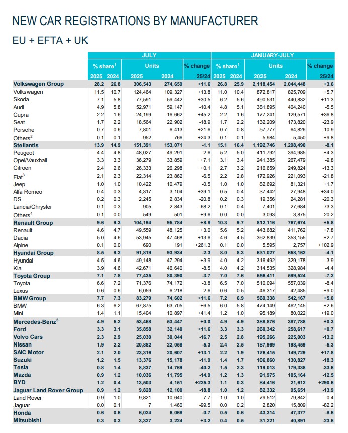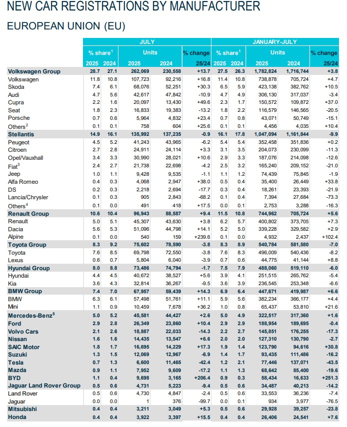 Avropa Avtomobil İstehsalçıları Birliyinin (ACEA) məlumatına görə, Avropa Birliyi, Avropa Azad Ticarət Birliyi (EFTA) və İngiltərədə yeni avtomobil satışları iyulda 1,09 milyon ədədə çatıb.