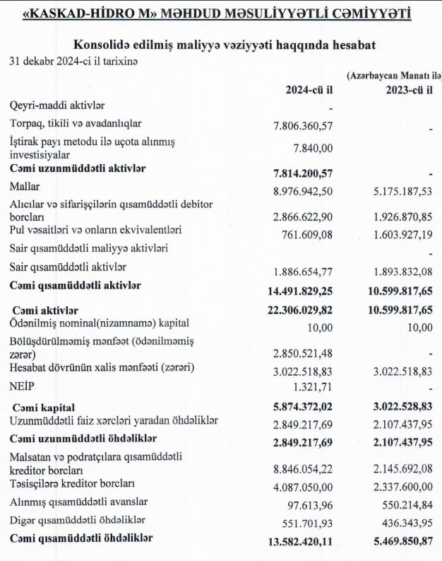 Marja.az xəbər verir ki, "Kaskad-Hidro M"in gəlirləri 2023-cü ildə 11 milyon 434 min manat ikən, 2024-cü ildə 14 milyon 113 min manata yüksəlib (2 milyon 680 min manat və ya 23,4% artıb).