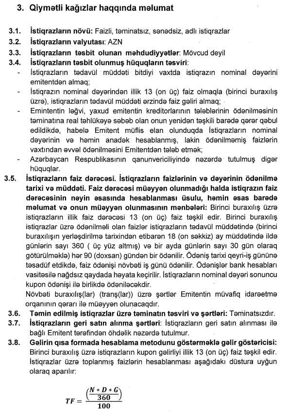 Tədavül müddəti 18 ay olan istiqrazların illik faiz dərəcəsi 13 faiz (ilk 20 milyon manatlıq yerləşdirmə üzrə), istiqrazlar üzrə faiz ödənişi dövrünün müddəti 90 gündən birdir.