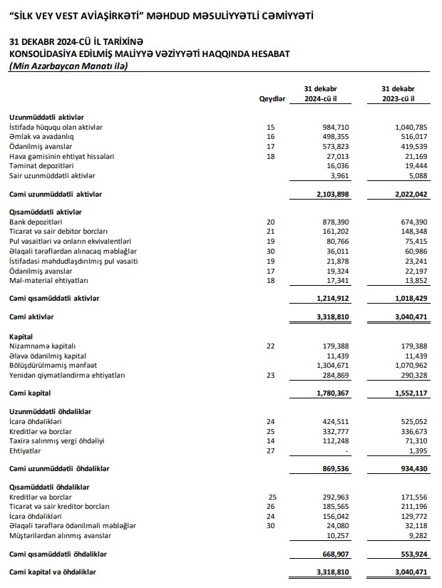 31 dekabr 2024-cü il tarixində "Silk Vey Vest Aviaşirkəti"nin bölüşdürülməmiş mənfəəti 1 milyard 304 milyon 671 min manata çatıb.