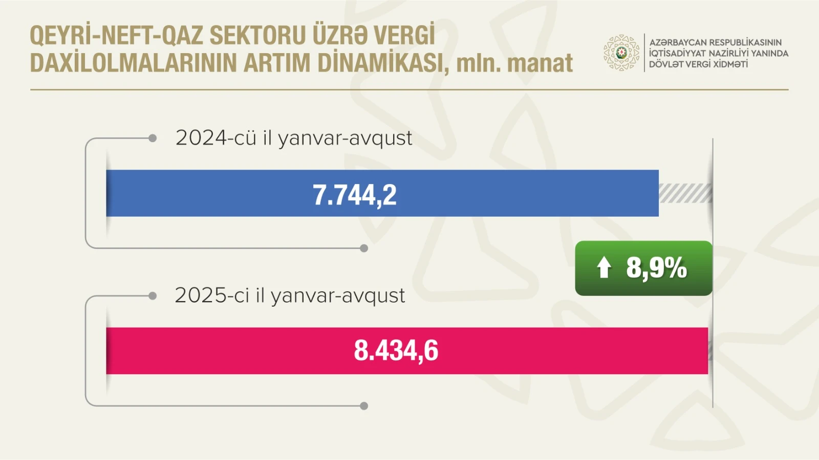 Qeyri-neft-qaz sektorunda daxilolmalar 8 milyard 434,6 milyon manat olub, proqnoz 103 faiz icra olunub. Əvvəlki ilin müvafiq dövrü ilə müqayisədə bu sektordan vergi daxilolmaları 690,4 milyon manat və ya 8,9 faiz çox olub. Ödənilən vergilərin 73,0 faizi qeyri-neft-qaz sektorunun, 27,0 faizi isə neft-qaz sektorunun payına düşüb.