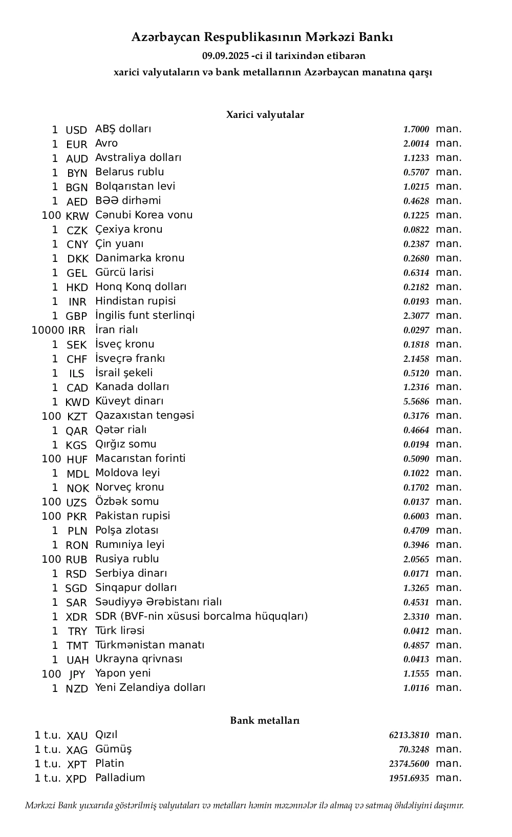 Rəsmi məzənnələr açıqlandı