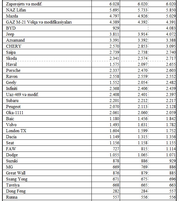Marja.az Dövlət Statistika Komitəsinin "Minik avtomobillərinin markalarına görə bölgüsü" hesabatına istinadən xəbər verir ki, Azərbaycanda ən çox Vaz (2101, 03-06, 2105, 2107, 2108, 2109, 2121, 2102, 2104), Mercedes, Hyundai, Toyota, KIA, Opel, Chevrolet, GAZ, Nissan və BMW markasının modelləri sürülür.