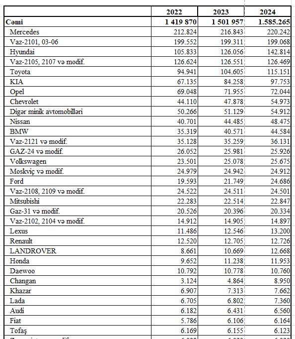 2024-cü ilin sonunda Azərbaycanda 401 min 66 ədəd VAZ, 220 min 242 ədəd Mercesdes, 142 min 814 ədəd Hyundai, 115 min 151 ədəd Toyota, 97 min 753 ədəd KİA, 72 min 44 ədəd Opel, 54 min 73 ədəd Chevrolet, 50 min 852 ədəd GAZ, 48 min 475 ədəd Nissan, 44 min 584 ədəd BMW markalı minik avtomobili dövlət qeydiyyatında olub.