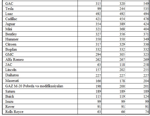Minik avtomobillərinin markalarına görə bölgüsü, ədəd