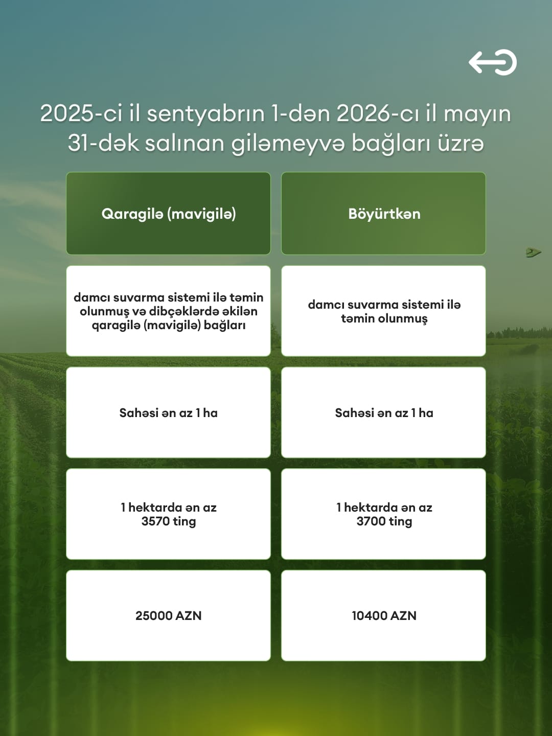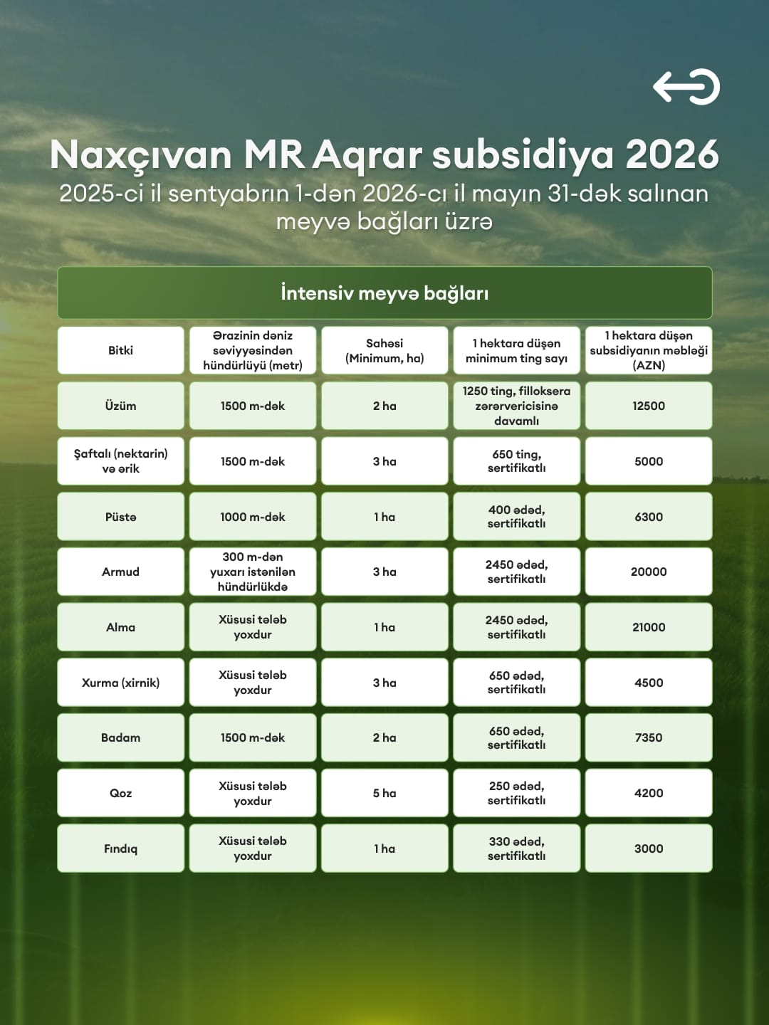 Nazirliyin yaydığı məlumatda bildirilir ki, yeni qaydalara əsasən, 2025-ci il sentyabrın 1-dən 2026-cı il mayın 31-dək Naxçıvanda salınacaq bir sıra meyvə bağlarına ölkədə indiyədək tətbiq olunmuş ən yüksək birdəfəlik subsidiya məbləğləri ödəniləcək.