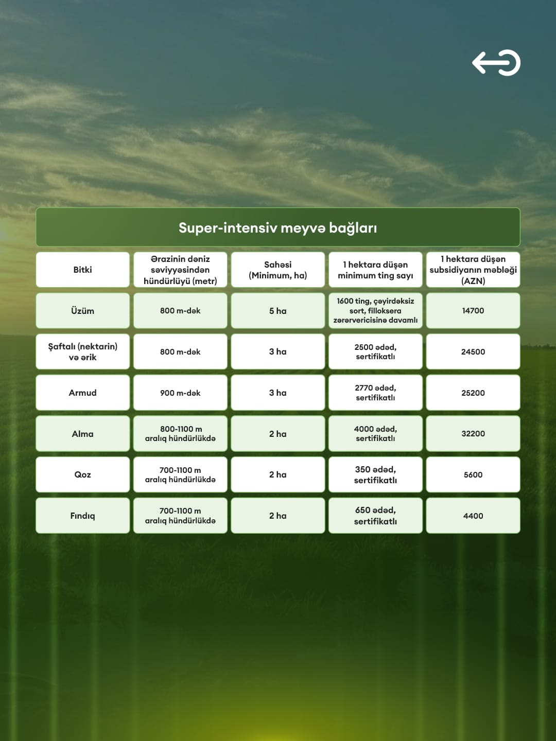 Subsidiya əldə etmək üçün fermerlər bir sıra vacib şərtlərə əməl etməlidirlər. Bunlara torpaq analizinin aparılması, aqrar sığortanın mövcudluğu, bağların intensiv və superintensiv texnologiyalarla salınması, ting sıxlığının normativlərə uyğunluğu, damcı suvarma sistemlərinin tətbiqi, sertifikatlı tinglərdən istifadə və bəzi məhsullar üzrə minimal əkin sahəsinin təmin olunması daxildir.