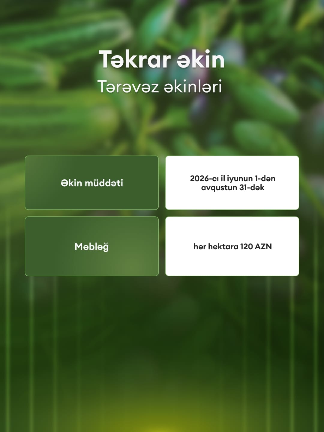 Naxçıvan fermerləri üçün xüsusi müəyyən edilmiş subsidiyalardan biri də təkrar tərəvəz əkinləri üçündür. Muxtar Respublikada suvarılan ərazilərdə 2026-cı il iyunun 1-dən avqustun 31-dək aparılacaq tərəvəz əkinlərinin hər hektarına 120 manat məbləğində subsidiya ödəniləcək.