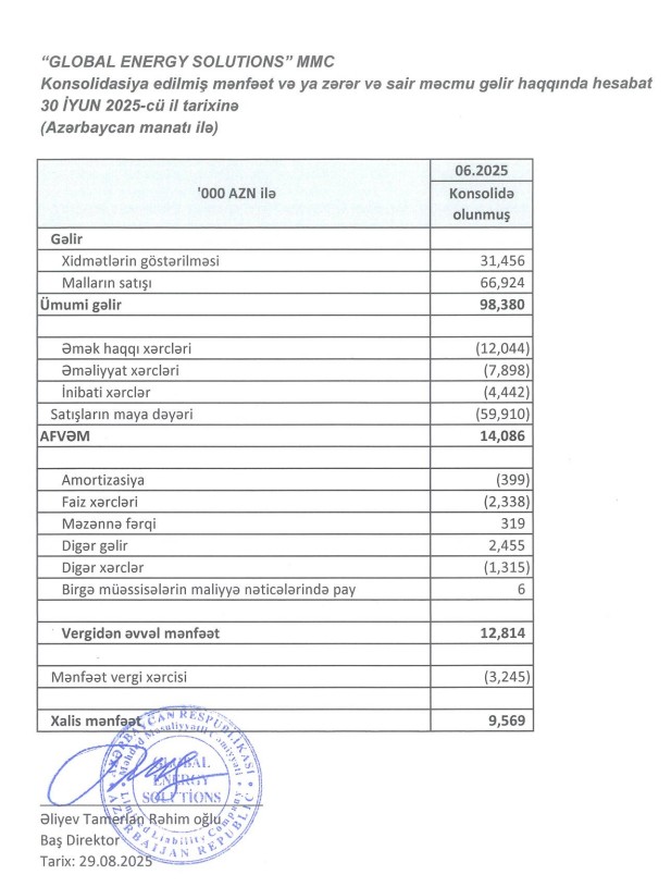 "Global Energy Solutions" MMC (Glensol) 2025-ci ilin 1-ci yarısını (yanvar-iyun) dövrünü 9 milyon 569 min manat xalis mənfəət ilə başa vurub.