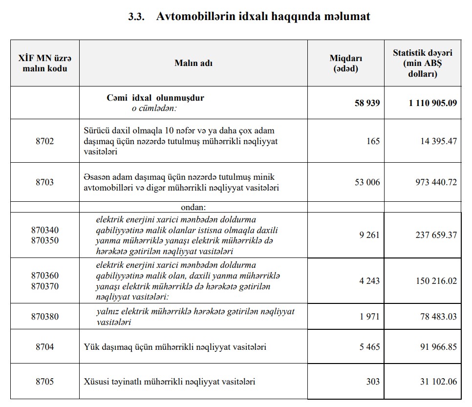 2025-ci ilin 8 ayı ərzində (yanvar-avqust) Azərbaycana 1 milyard 381 milyon 386 min dollar (cari məzənnə ilə 2 milyard 348 milyon manat) dəyərində 74 min 481 ədəd avtomobil idxal olunub. Başqa sözlə, ölkəmizə hər ay orta hesabla 9 min 310 ədəd avtomobil gətirilib.