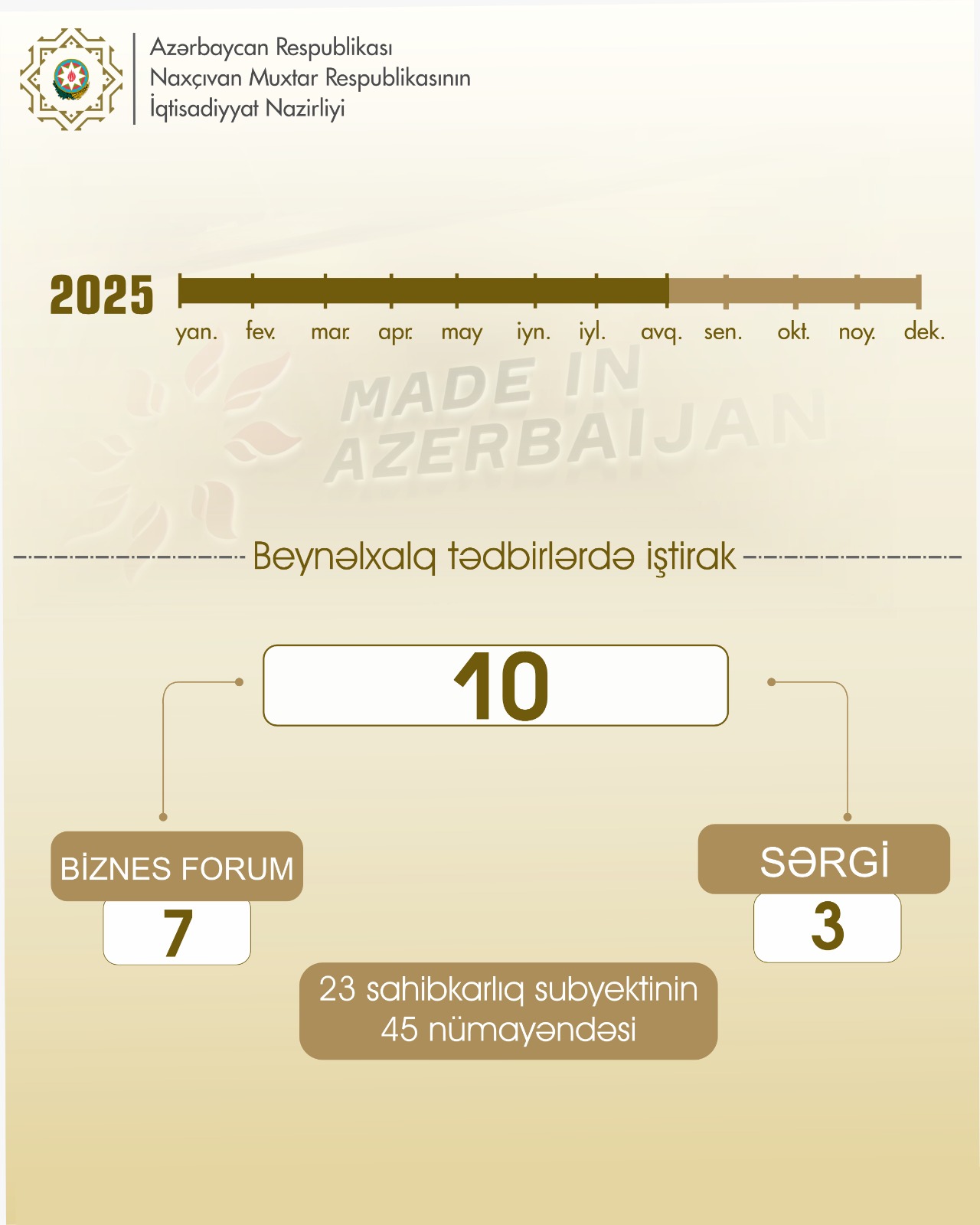 2025-ci ilin 8 ayı ərzində 7-si biznes-forum, 3-ü sərgi olmaqla keçirilmiş 10 beynəlxalq tədbirdə muxtar respublikada fəaliyyət göstərən 23 sahibkarlıq subyektinin 45 nümayəndəsi iştirak edib.