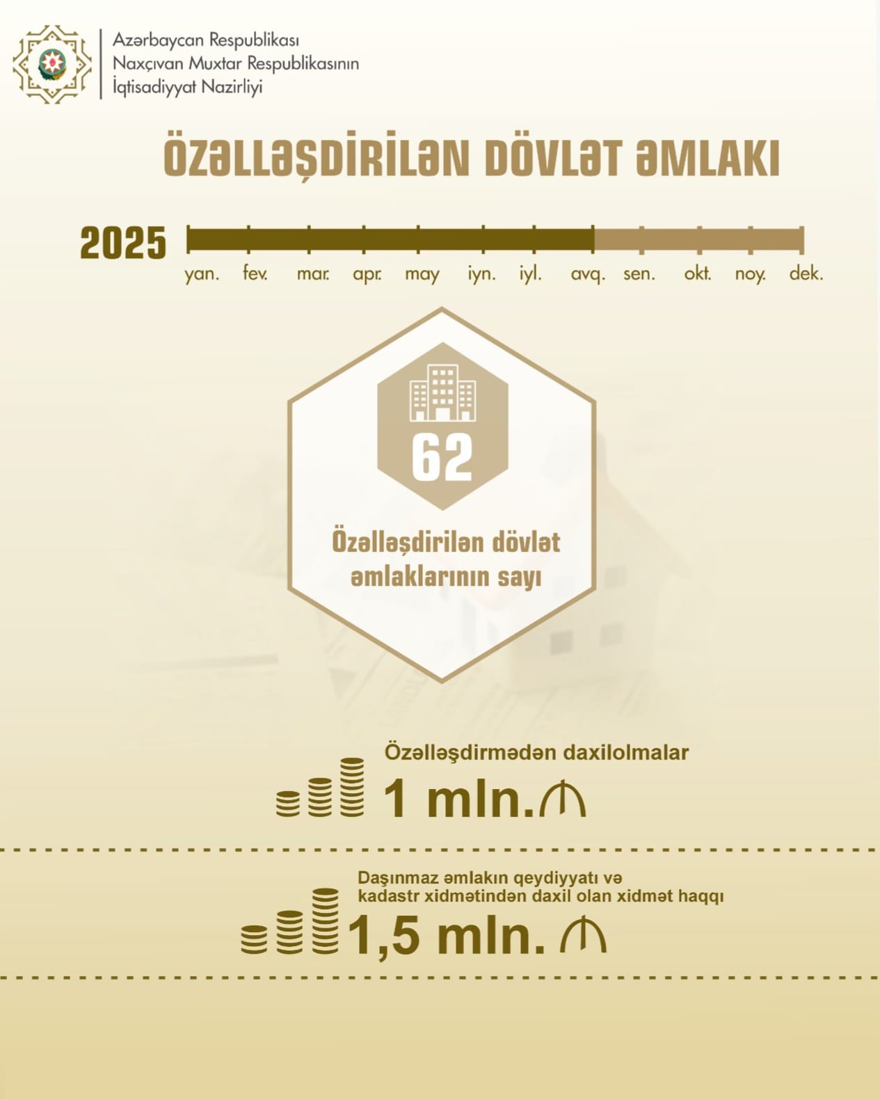 Bu ilin yanvar-avqust ayları ərzində Naxçıvan Muxtar Respublikasında 62 dövlət əmlakı özəlləşdirilib, özəlləşdirmədən daxilolmalar 1 milyon manat təşkil edib.