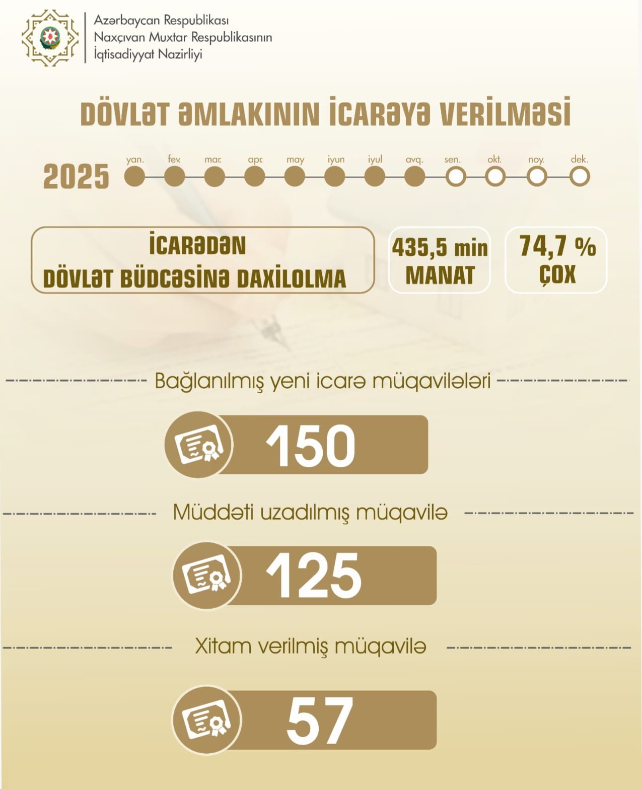 Cari ilin 8 ayı ərzində muxtar respublikada dövlət əmlakının icarəyə verilməsi ilə bağlı 150 yeni icarə müqaviləsi bağlanılıb ki, ötən ilin eyni dövrü ilə müqayisədə 59,6 faiz çoxdur. Hesabat dövründə 125 müqavilənin müddəti uzadılıb, 57 müqaviləyə xitam verilib.