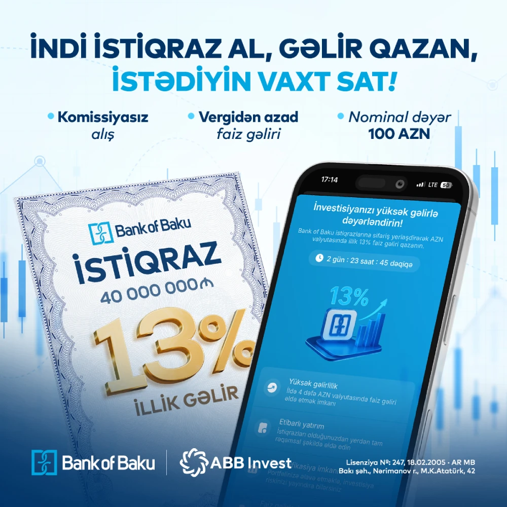 Bank of Baku istiqrazlarını ALIN, illik 13% GƏLİR QAZANIN, İSTƏDİYİNİZ VAXT SATIN