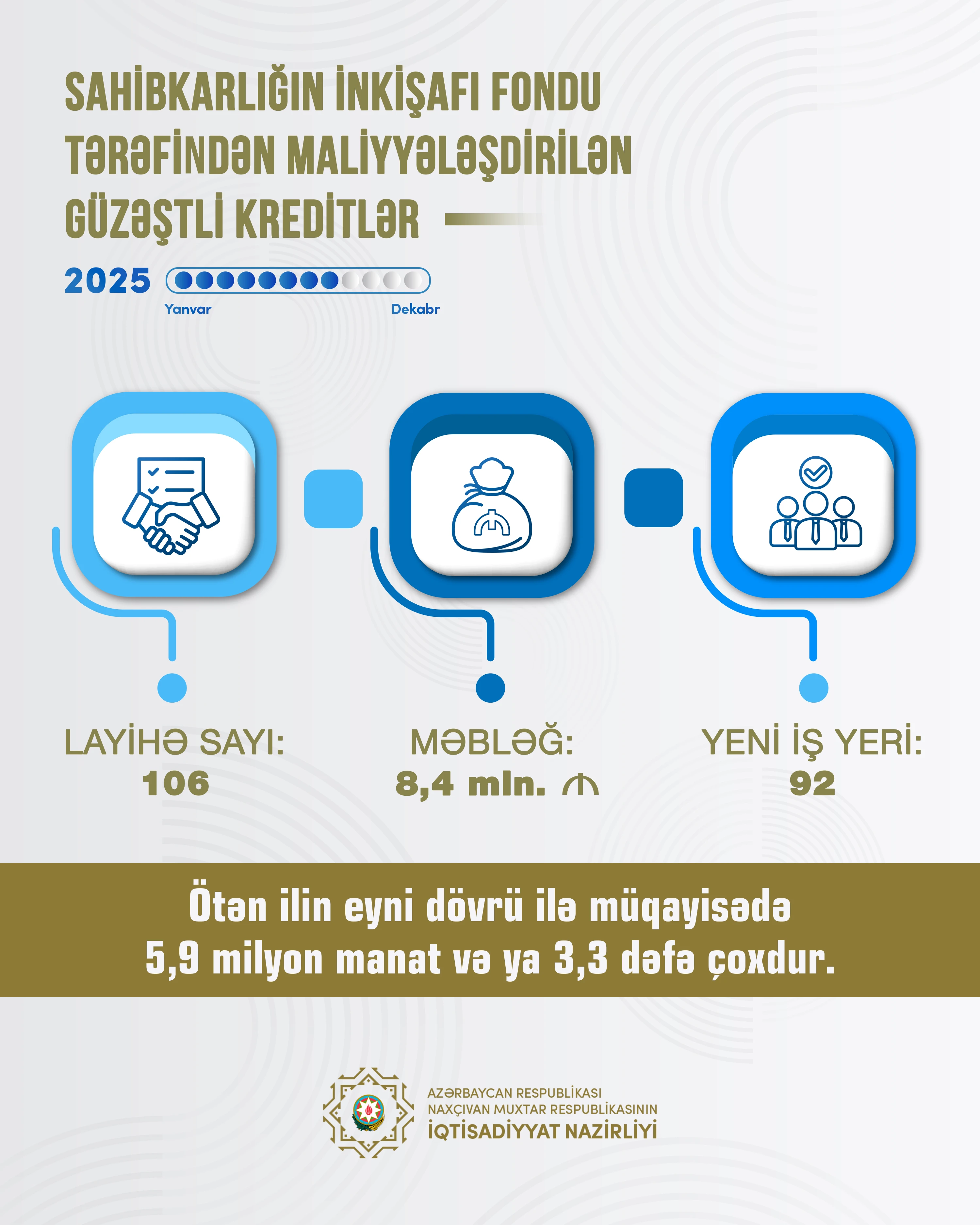 2025-ci ilin yanvar–avqust ayları ərzində Naxçıvan Muxtar Respublikası Sahibkarlığın İnkişafı Fondu tərəfindən 106 layihəyə ümumilikdə 8 milyon 405 min 500 manat məbləğində güzəştli maliyyə dəstəyi göstərilib. Bu da ötən ilin eyni dövrü ilə müqayisədə 5 milyon 868 min 500 manat və ya 3,3 dəfə çoxdur.