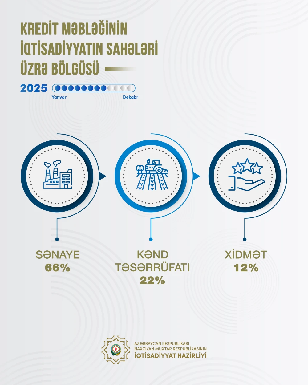 2025-ci ilin yanvar–avqust aylarında Naxçıvan Muxtar Respublikası Sahibkarlığın İnkişafı Fondunun güzəştli kredit mexanizmi iqtisadiyyatın müxtəlif sahələrində fəaliyyət göstərən sahibkarları əhatə edib. Bu dövrdə maliyyələşdirilən kreditlərin 66 faizi sənaye, 22 faizi kənd təsərrüfatı, 12 faizi isə xidmət sahəsində həyata keçirilən layihələrə yönəldilib.