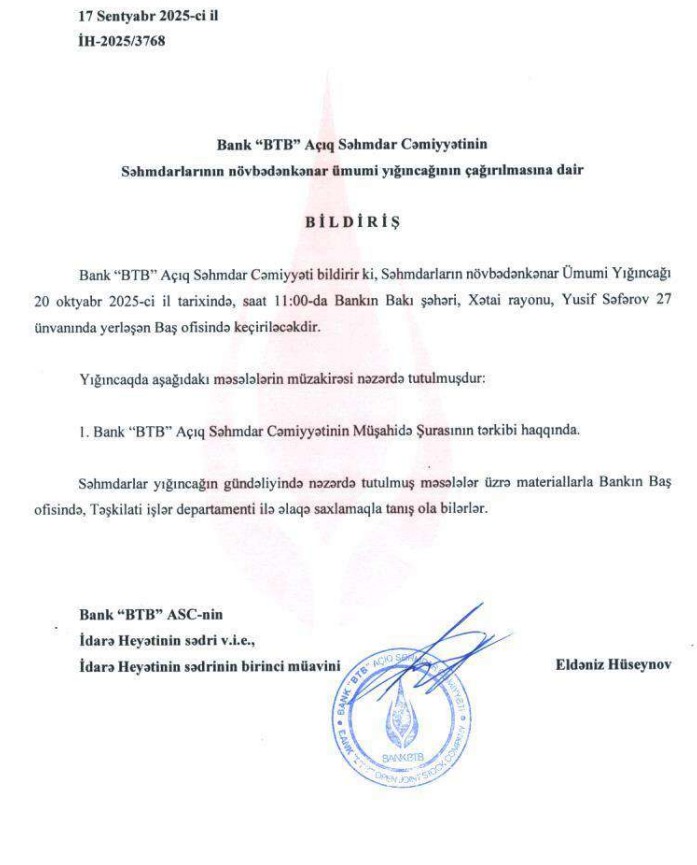 20 Oktyabr 2025-ci il tarixində Bank "BTB" ASC səhmdarlarının növbədənkənar Ümumi Yığıncağı keçiriləcək.