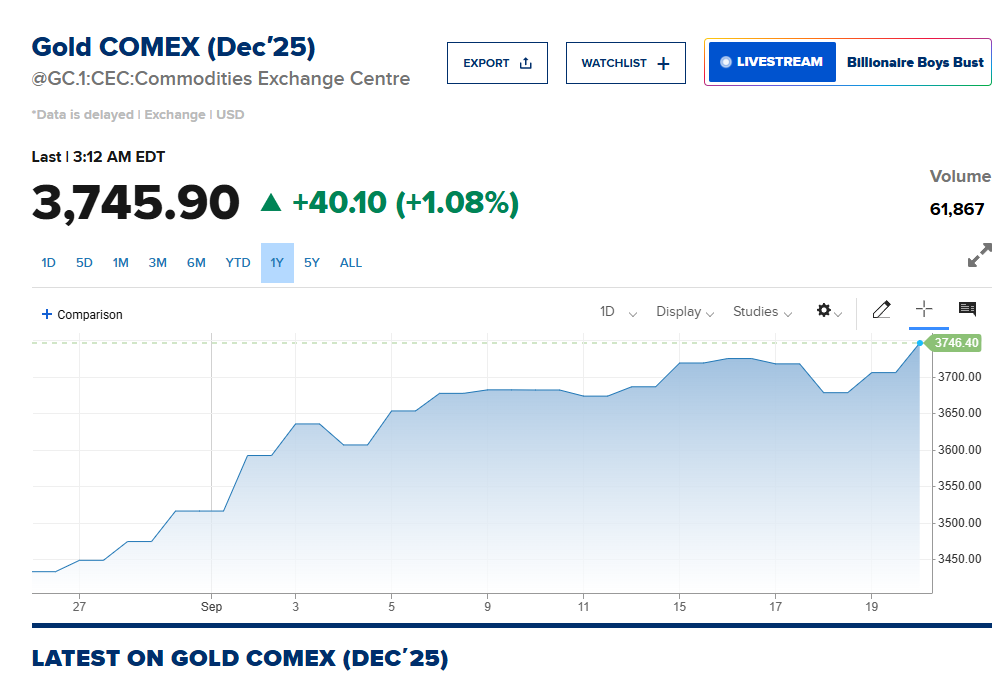 Bazar ertəsi qızıl qiymətləri artaraq rekord yeniləyiblər. ABŞ Federal Ehtiyat Sisteminin (FED) son faiz dərəcəsi endirimindən sonra əlavə azalmaların gözlənilməsi qiymətli metallar bazarına dəstək verir.Bakı vaxtı ilə saat 10:44-də Comex birjasında dekabr ayı üçün qızıl fyuçerslərinin qiyməti 1,23% artaraq bir unsiya üçün 3753,4 ABŞ dollarına çatıb. Qızılın qiyməti 1 faizdən çox artıb.