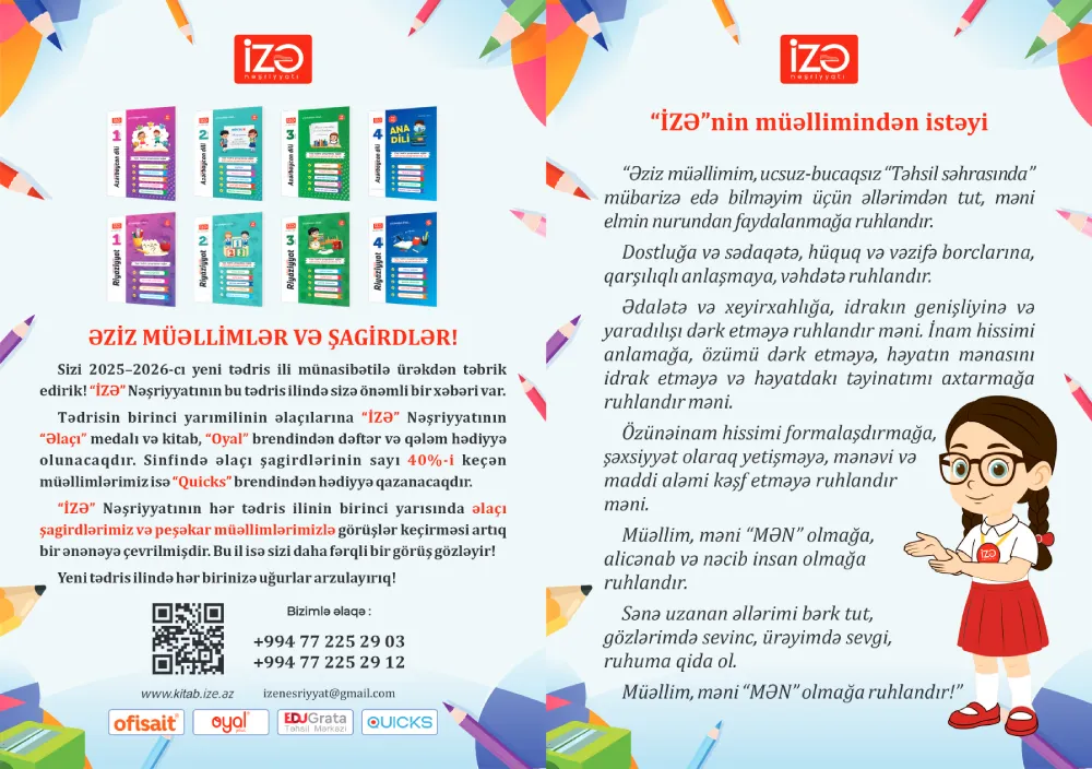 “İkihissəli, yüngül və ağ kağızda hazırlanmış bu vəsait şagirdlər üçün rahat, müəllim və valideynlər üçün güvənlidir. Bu, sadəcə, dərs vəsaiti deyil – monitorinqə aparan uğur yoludur. “İZƏ” ilə öyrənmək daha asan, daha əyləncəli, daha uğurludur”,- nəşriyyatdan bildirilib.