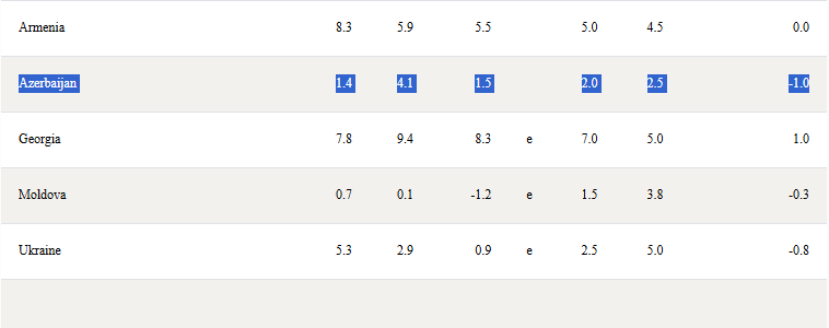 Avropa Yenidənqurma və İnkişaf Bankı (AYİB, EBRD) Azərbaycan iqtisadiyyatının 2025-ci ildə 2 %, 2026-cı ildə isə 2,5 % artacağını proqnozlaşdırır.