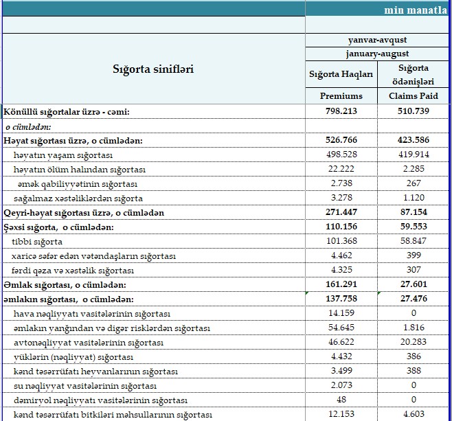 Siniflər üzrə 2025-ci ilin yanvar-avqust ayları üzrə hesablanmış sığorta haqları və sığorta ödənişləri