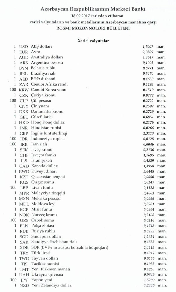 Sentyabrın 18-nə Mərkəzi Bankın açıqladığı rəsmi Dollar/manat məzənnəsi Sentyabrın 15-i ilə müqayisədə dəyişmiyərək 1,7007 manat olub, Avro/manat məzənnəsi isə 2.0309 manata qalxıb.