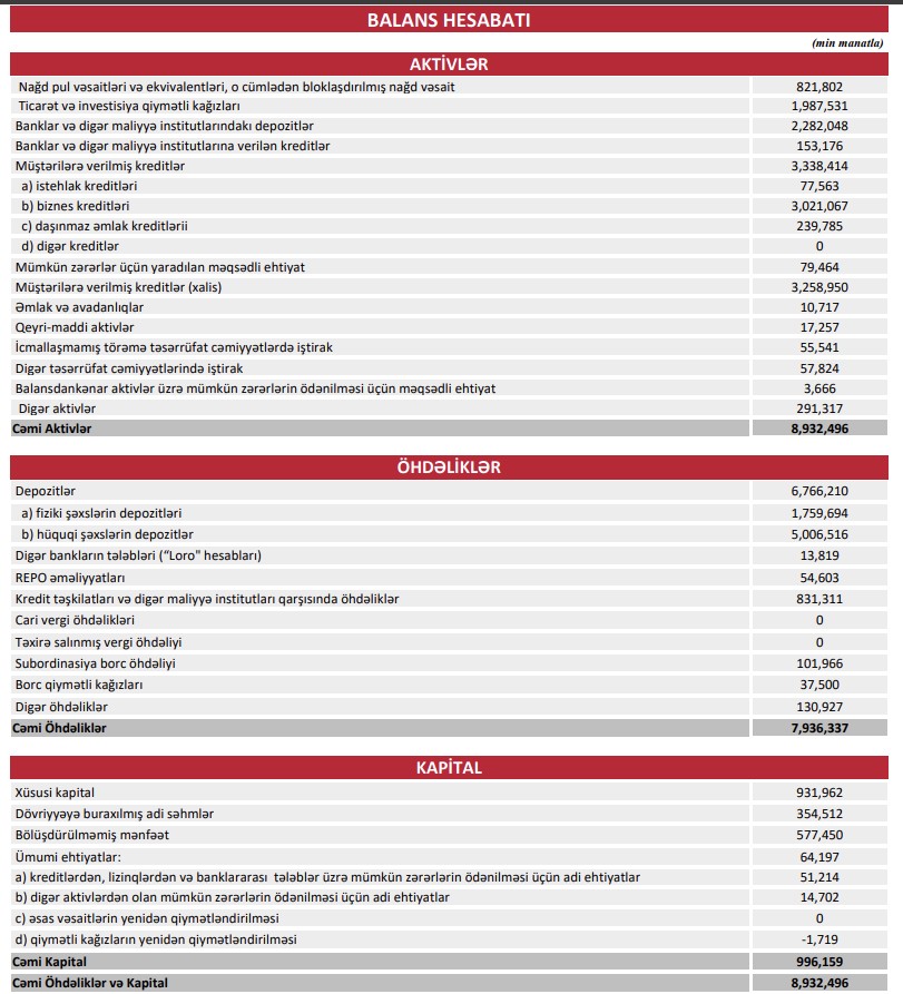 Kredit portfeli isə 3 milyard 338 milyon 414 min manat olub (ötən ilin sonu – 3 milyard 303 milyon 277 min manat).